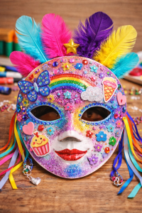 My Carnival mask is very colourful. It has got many feathers, some stickers, and a rainbow.